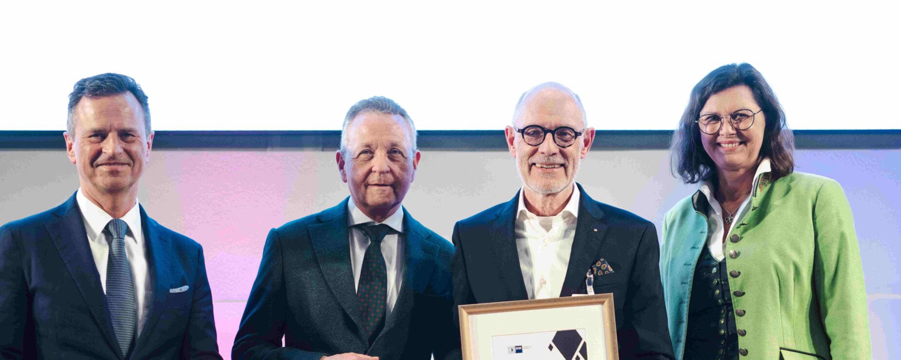 Bei der Verleihung des IHK-Ehrenzeichens am 5. März 2024 in der IHK für München und Oberbayern: (v.l.n.r.) IHK-Hauptgeschäftsführer Manfred Gößl, IHK-Präsident Klaus Josef Lutz, Fritz Peters und Landtagspräsidentin Ilse Aigner (CSU) (Bild: Andreas Gebert für die IHK München)
